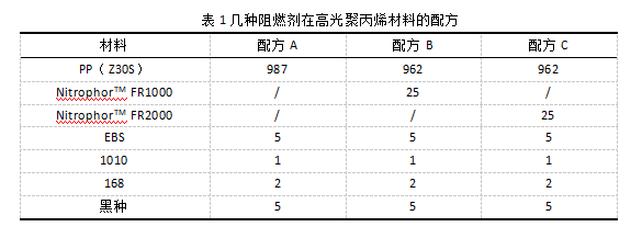 聚丙烯低鹵環(huán)保阻燃劑(NitrophorTM FR1000):清遠市普塞呋磷化學(xué)有限公司;聚丙烯低鹵環(huán)保阻燃劑(NitrophorTM FR2000):清遠市普塞呋磷化學(xué)有限公司;均聚聚丙烯(Z30S):茂名石化,熔指28gg/10min;EBS:日本花王;1010:三豐化工;168:三豐化工;黑種:卡博特。