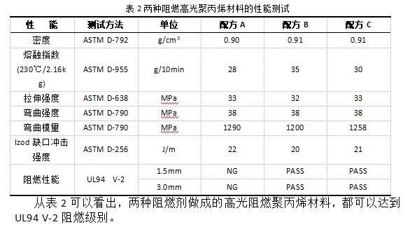 (1)聚丙烯低鹵環(huán)保阻燃劑NitrophorTMFR1000以及NitrophorTM FR2000在阻燃高光聚丙烯材料中,都可以滿足材料UL94V-2的阻燃要求;