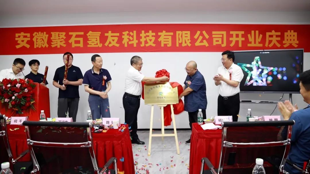 陳鋼董事長與安慶高新技術產業開發區黨工委書記、管委會主任楊旭東先生、合肥工業大學研究生院副院長丁運生先生、合肥工業大學資產經營有限公司副總經理何千先生共同揭開了覆蓋在公司牌匾上的紅綢,正式宣告安徽聚石氫友科技有限公司的成立。