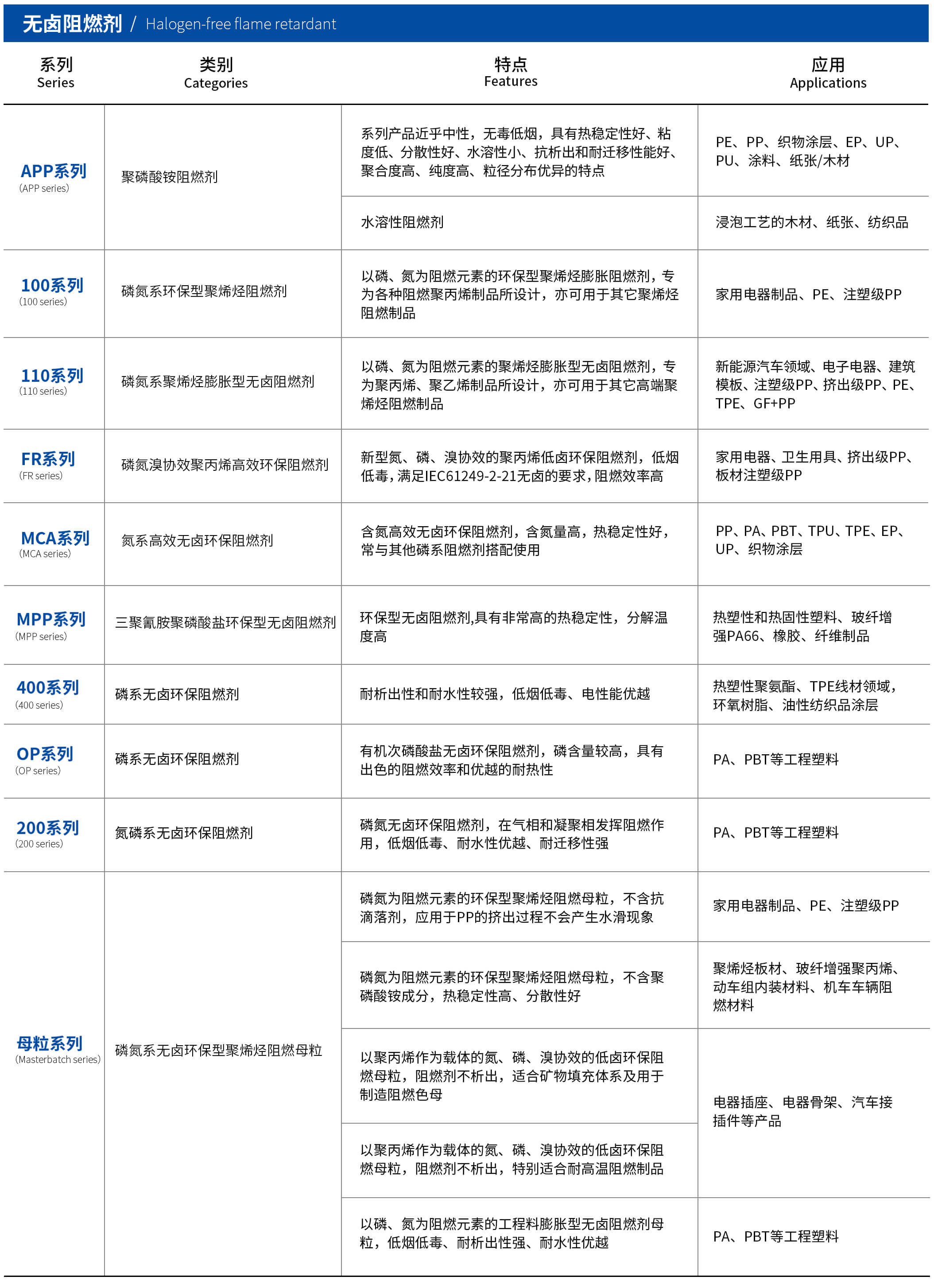 產品介紹:公司產品包括聚磷酸銨系列、EPFR-100系列、EPFR-110系列、MCA系列、FR系列、MPP系列、400系列、OP系列、200系列、母粒系列。