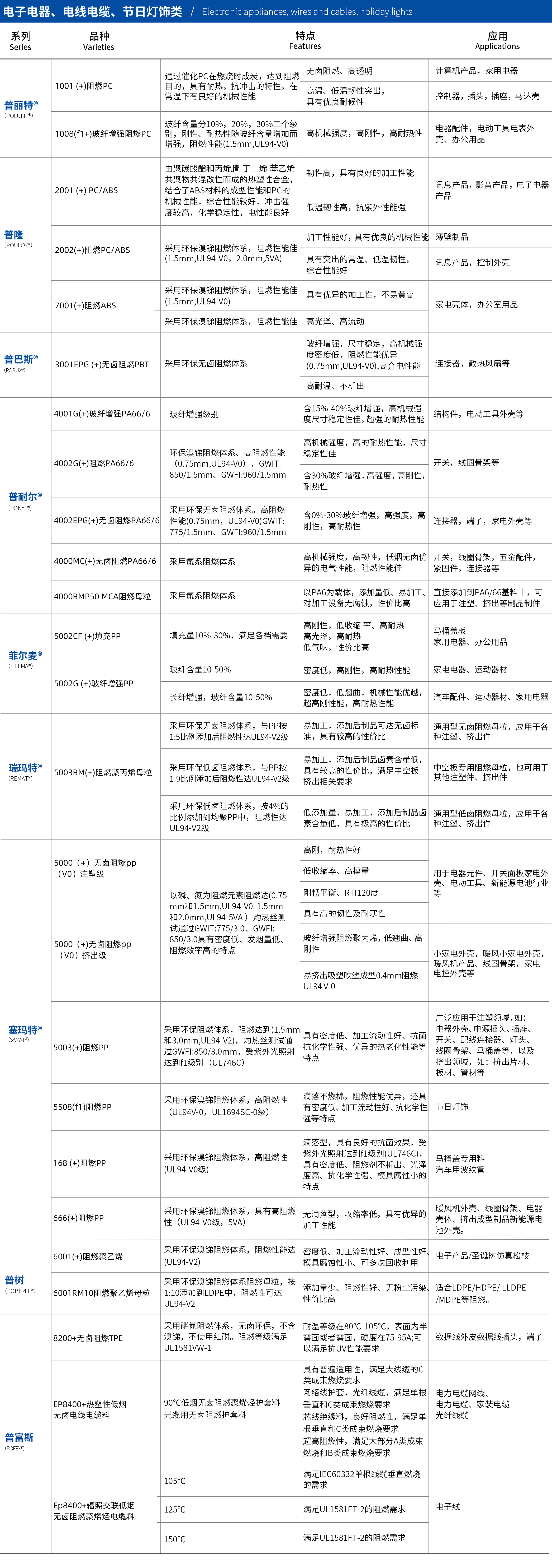 產品介紹:采用環保溴銻阻燃體系,高阻燃性(UL94 V-0,UL1694 SC-0級)。滴落不燃棉,阻燃性能優異,還具有密度低、加工流動性好、抗化學性強等特點。
